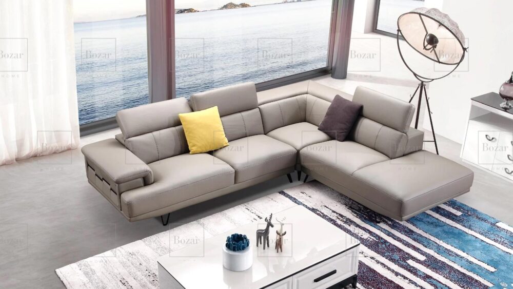 Canapé 3 places Soho, lignes minimalistes, tissu beige + finitions cuir.