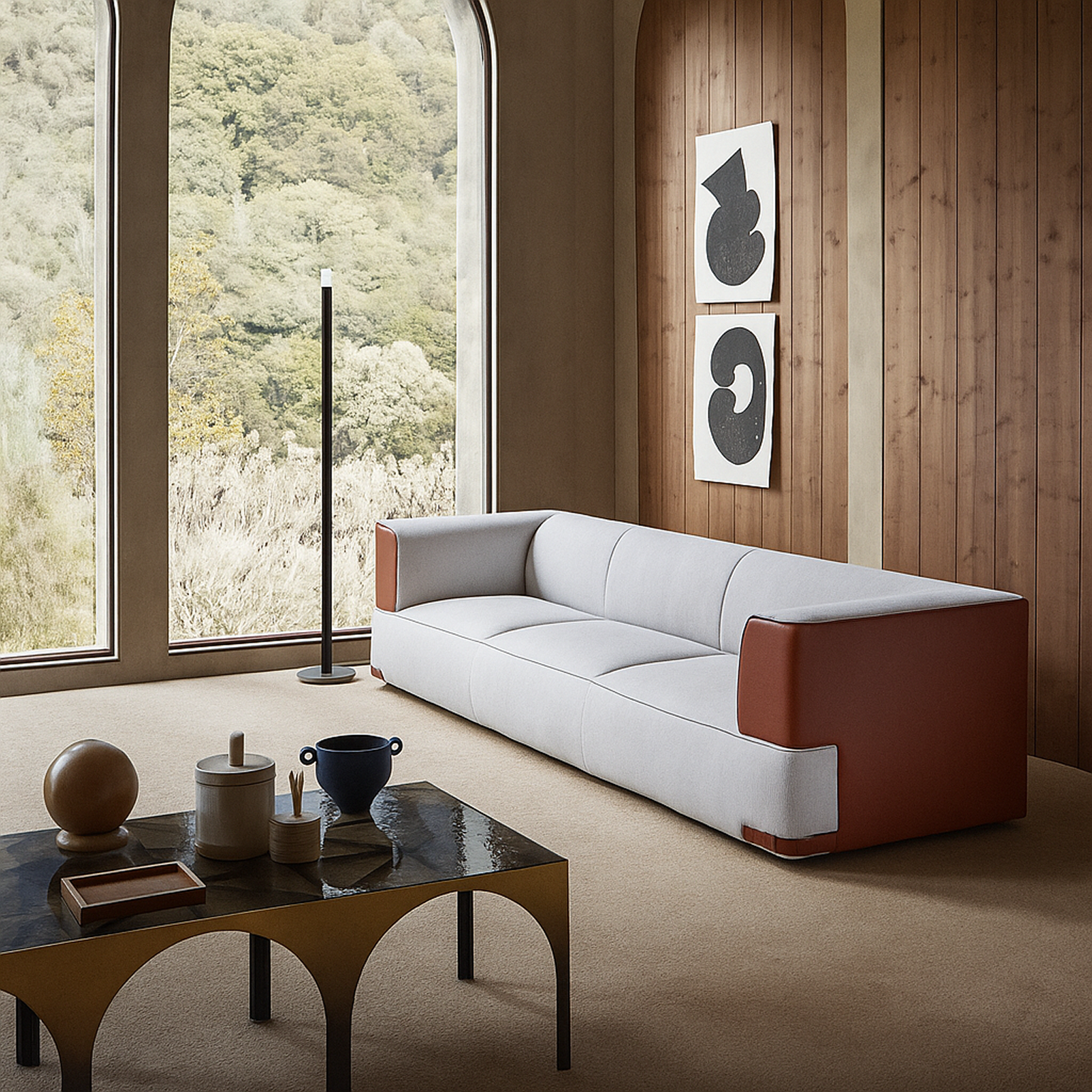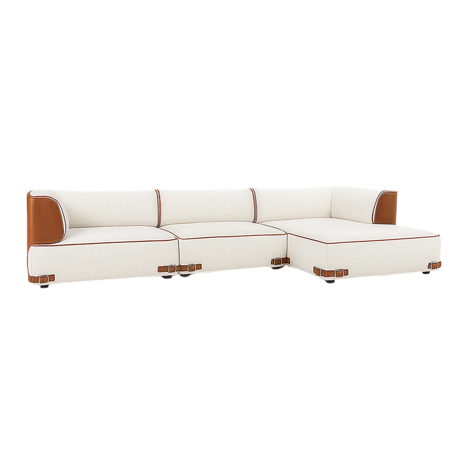 Un canapé modulable au design épuré, reconnaissable à ses liserés contrastés et ses sangles décoratives façon bagagerie. La méridienne à droite crée un vrai coin détente, tandis que le dossier bas allège visuellement l’ensemble. Le dos est entièrement fini : il peut se placer au centre de la pièce.