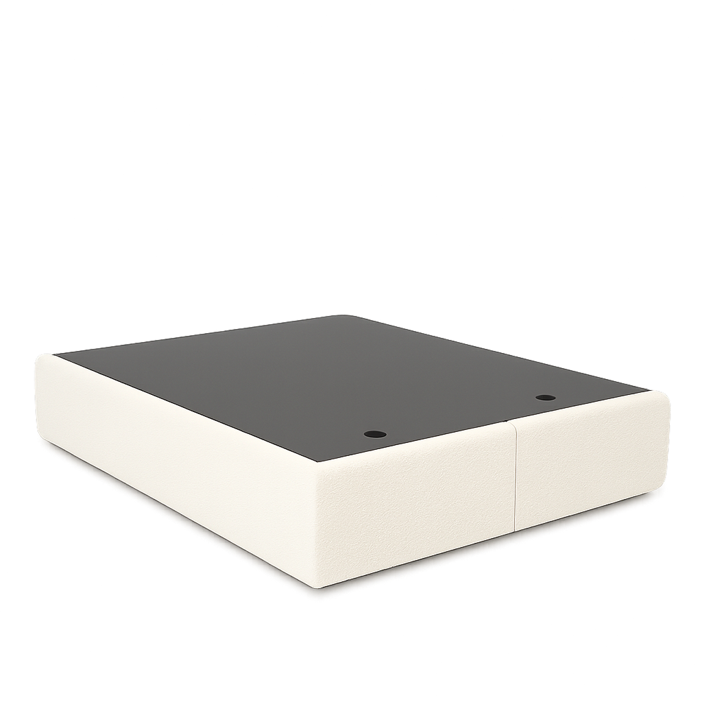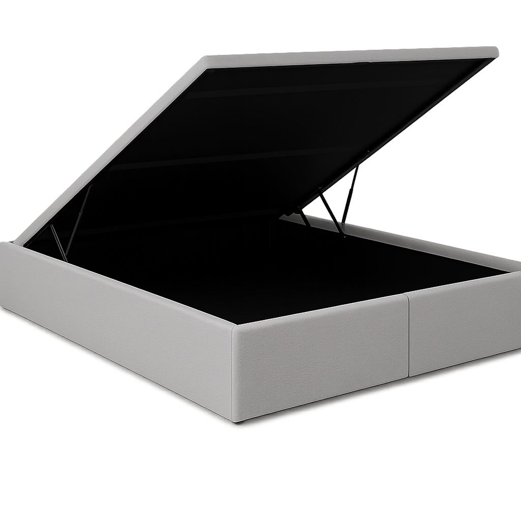Cette base coffre hydraulique offre un rangement discret et généreux sous le matelas. Grâce aux vérins à gaz, le plateau se lève sans effort et reste ouvert pendant que vous rangez couettes, oreillers ou linge de saison. Son habillage tapissé et ses angles adoucis apportent une touche moderne et élégante à la chambre.