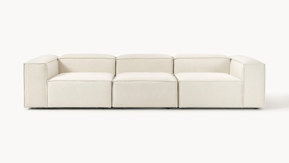 Canapé d’angle gris clair avec pouf indépendant terracotta.