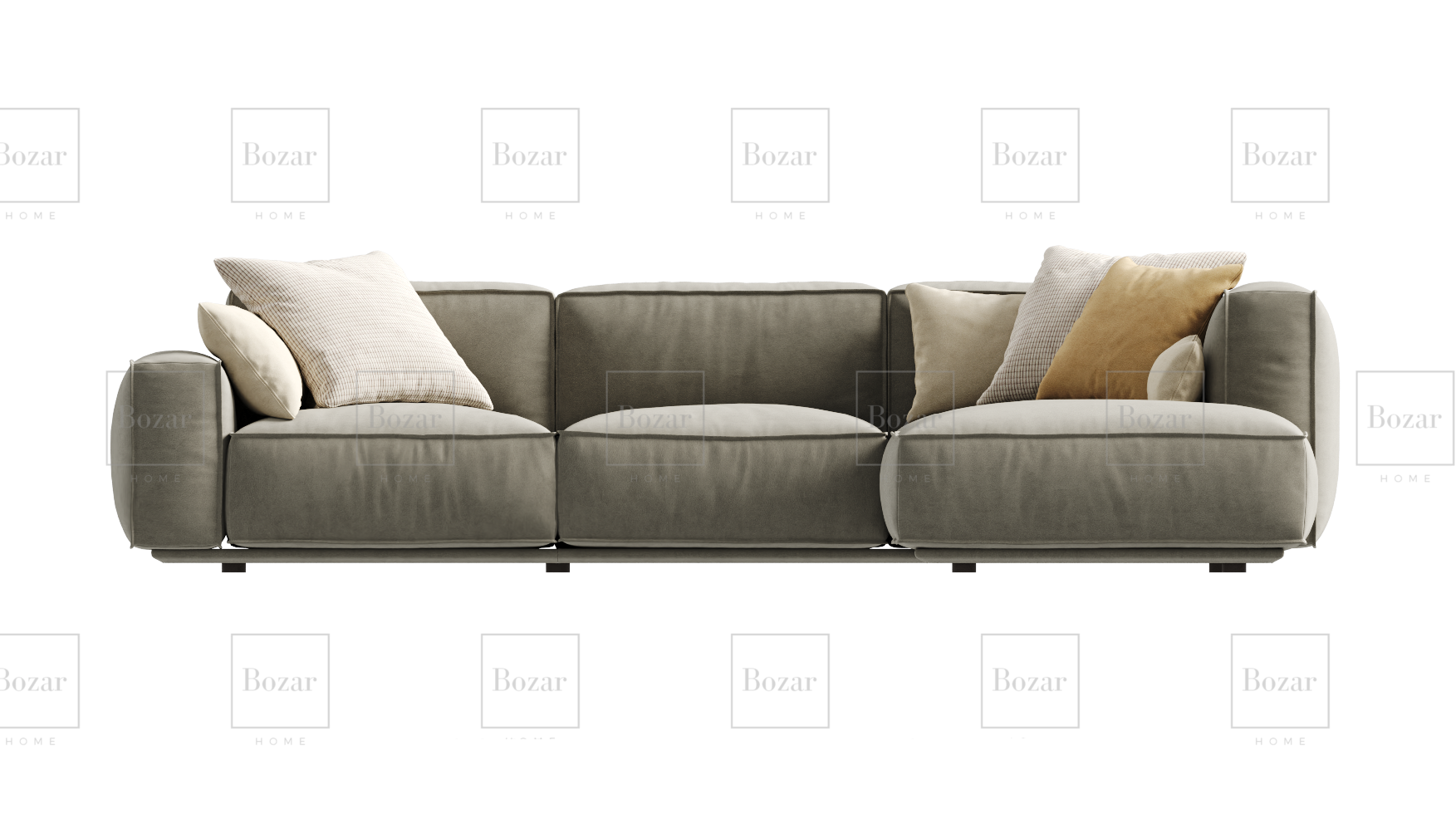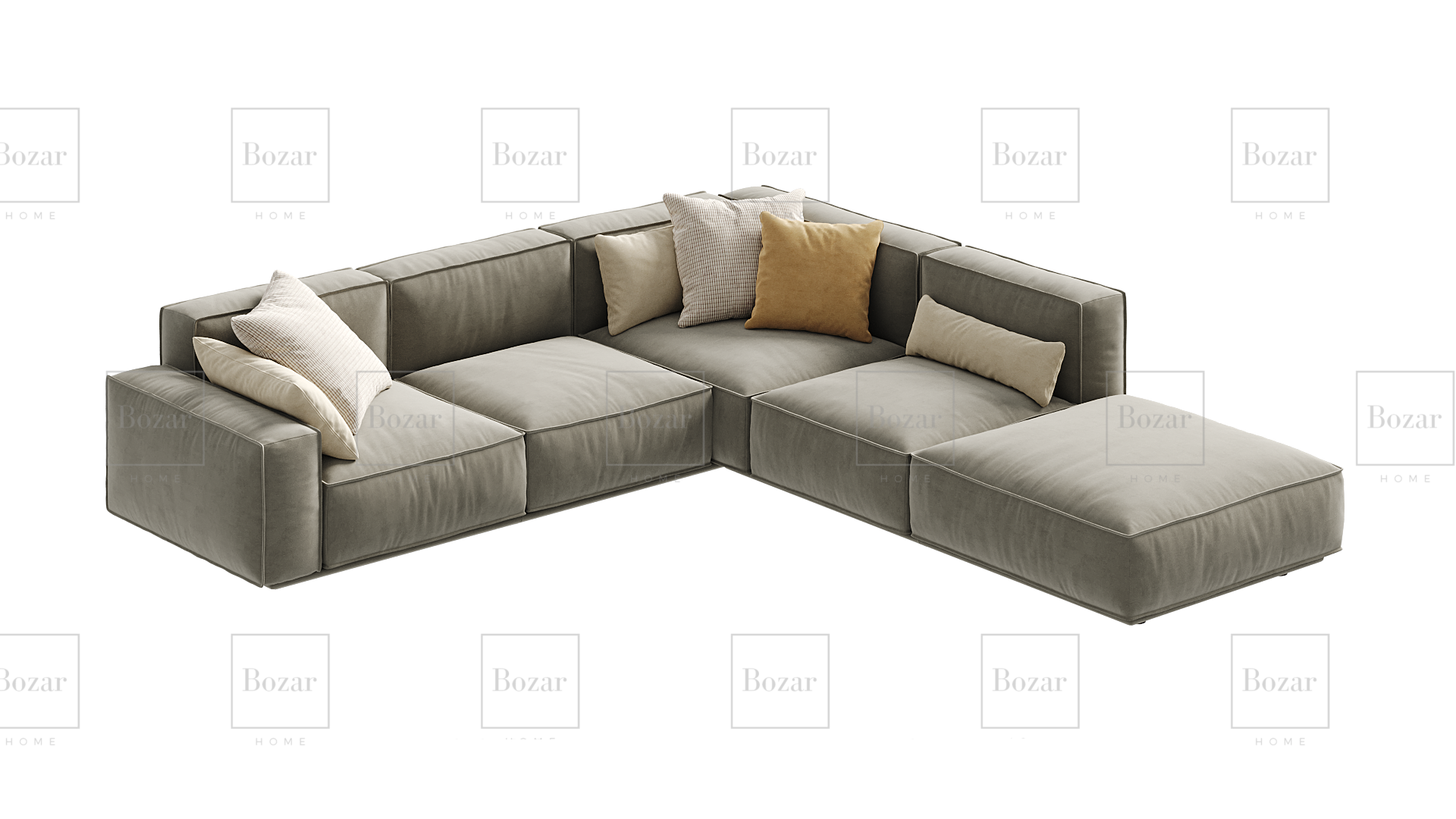 Ce canapé sectionnel Madira avec une extension de chaise longue est l’incarnation du confort et du style. Le canapé est recouvert d’un tissu gris clair, lui donnant une apparence contemporaine et neutre. Il y a cinq coussins sur le canapé, dont deux à rayures, deux gris solides et un coussin jaune solide, ajoutant une touche de couleur et de motif au design global.