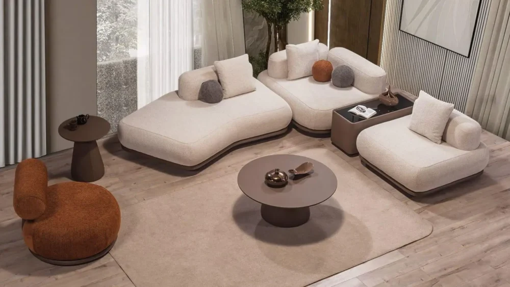 - Design moderne : Tons beige clair et marron, complétés par des coussins décoratifs gris et blancs.