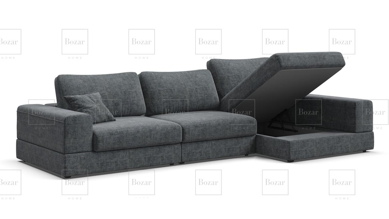 La section méridienne se distingue par son compartiment de rangement intégré, accessible en soulevant le dessus de la méridienne. Cette caractéristique ingénieuse transforme le canapé en une solution de rangement pratique, tout en offrant un espace de détente spacieux.
