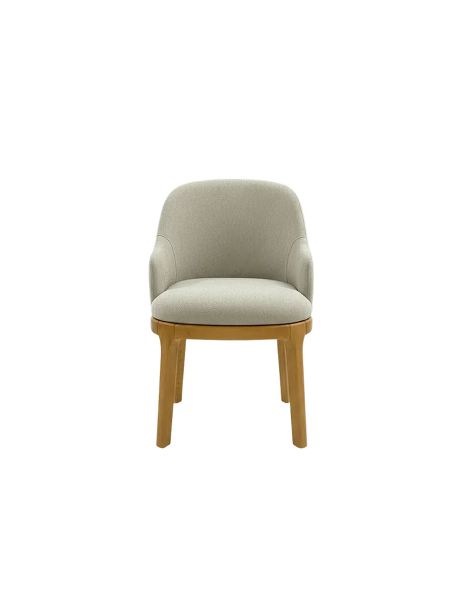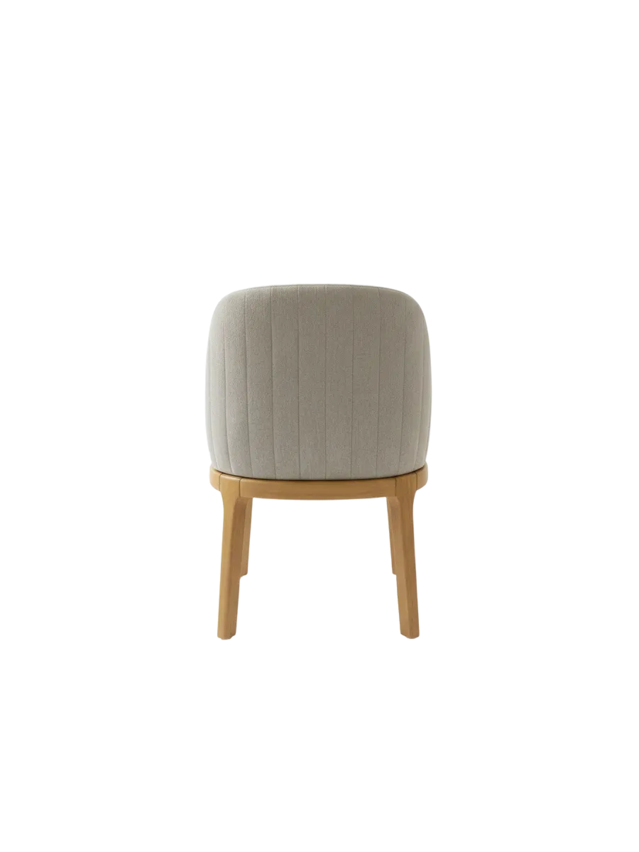 Chaise de salle à manger avec dossier arrondi et assise généreuse. Revêtement tissu beige, structure et pieds en bois. Idéale pour une ambiance chaleureuse et minimaliste. Coloris et tissus personnalisables sur demande.