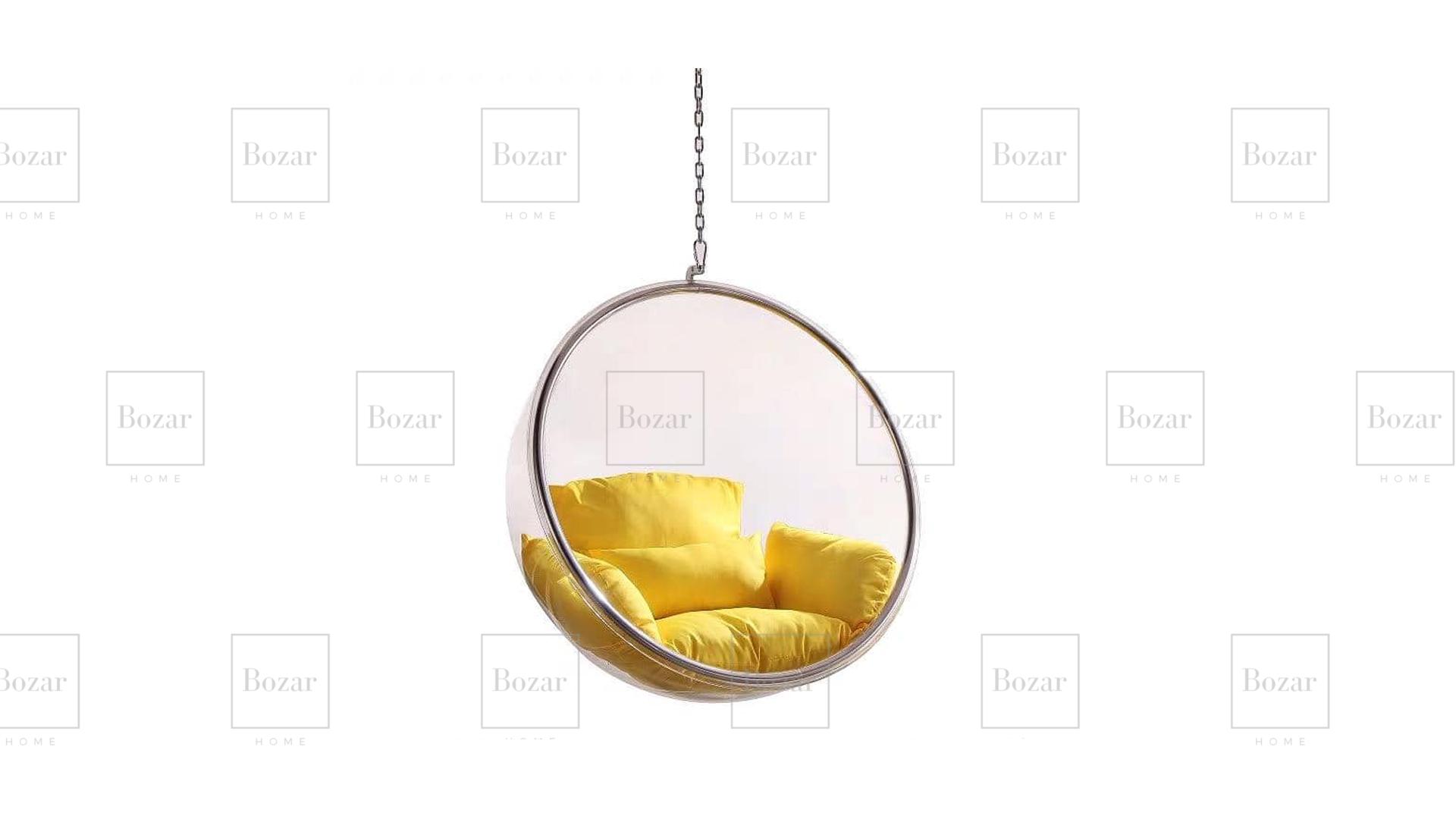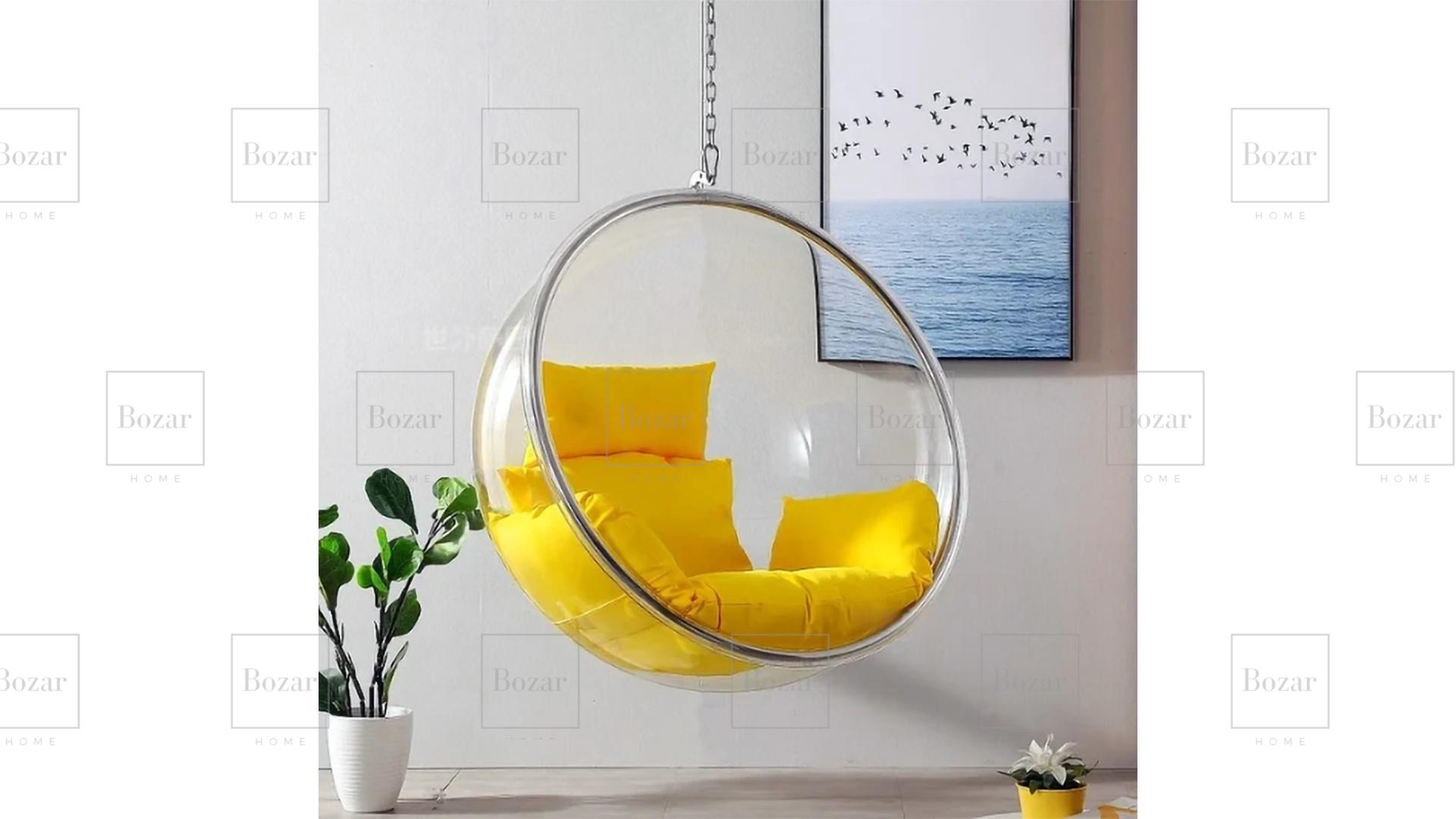 Fauteuil design en acryglass, matière très résistante aux chocs et transparente – Cerclage en métal chromé, vendu avec la chaîne d’accrochage (2m) et les 2 mousquetons de fixation – Il vous appartient d’installer un crochet sur votre plafond selon votre support et les normes de sécurité