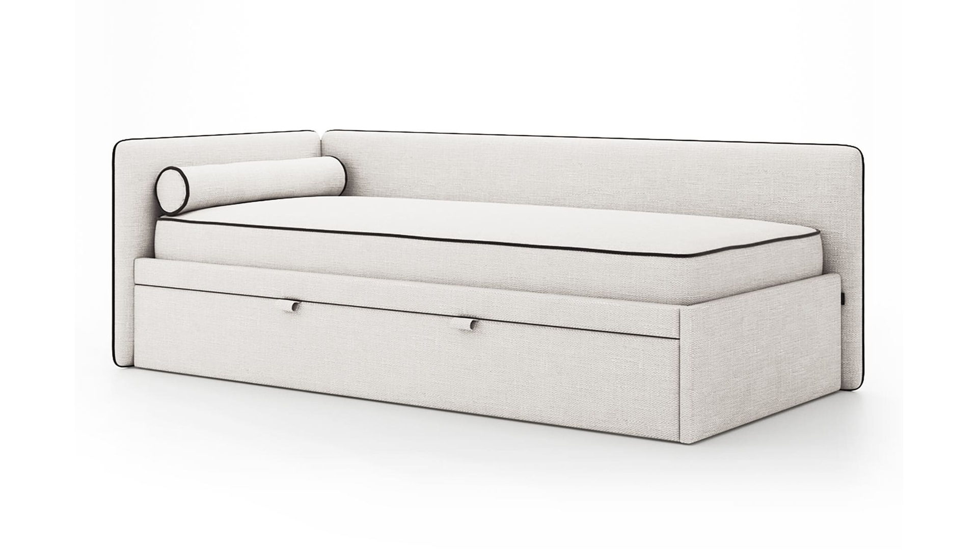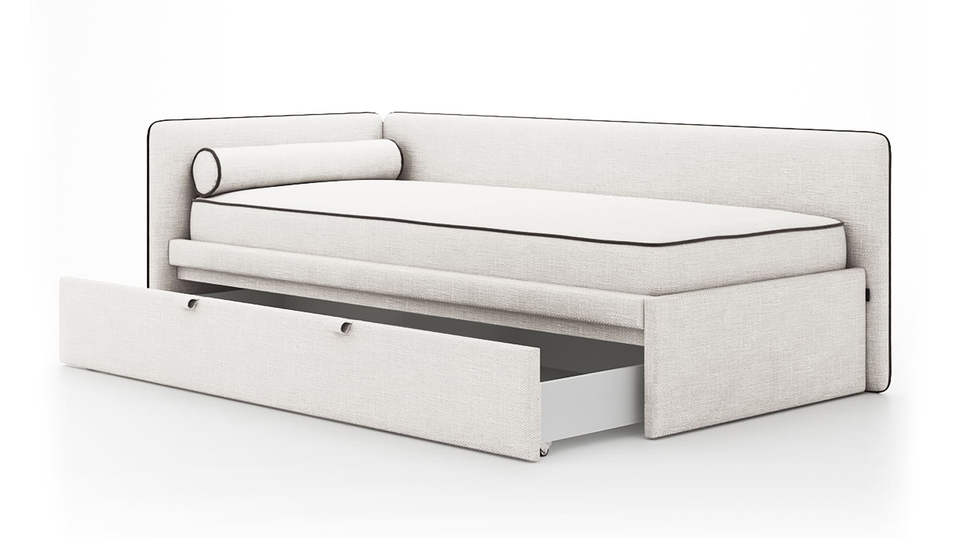 Le lit Arvin allie lignes douces et finitions élégantes, pensé pour les espaces enfants ou les chambres d’amis. Ses accoudoirs légèrement arrondis et sa finition passepoilée créent une atmosphère chaleureuse et soignée. Le cadre en contreplaqué de bouleau et bois massif assure robustesse et longévité. Sous l’assise, un tiroir discret permet de ranger literie ou jouets, tandis que des options comme le sommier relevable ou un second couchage sont disponibles sur demande. Le revêtement est personnalisable selon vos envies. Pieds invisibles en chêne teinté wengé.