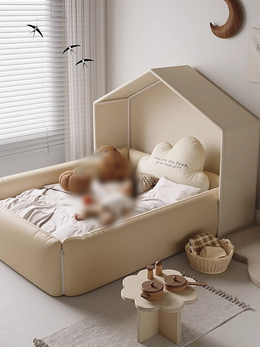 Lit enfant en forme de petite maison, capitonné d’un tissu rose poudré ultra doux, avec tête de lit enveloppante et rebords rembourrés pour un cocon sécurisé et chaleureux dans la chambre.