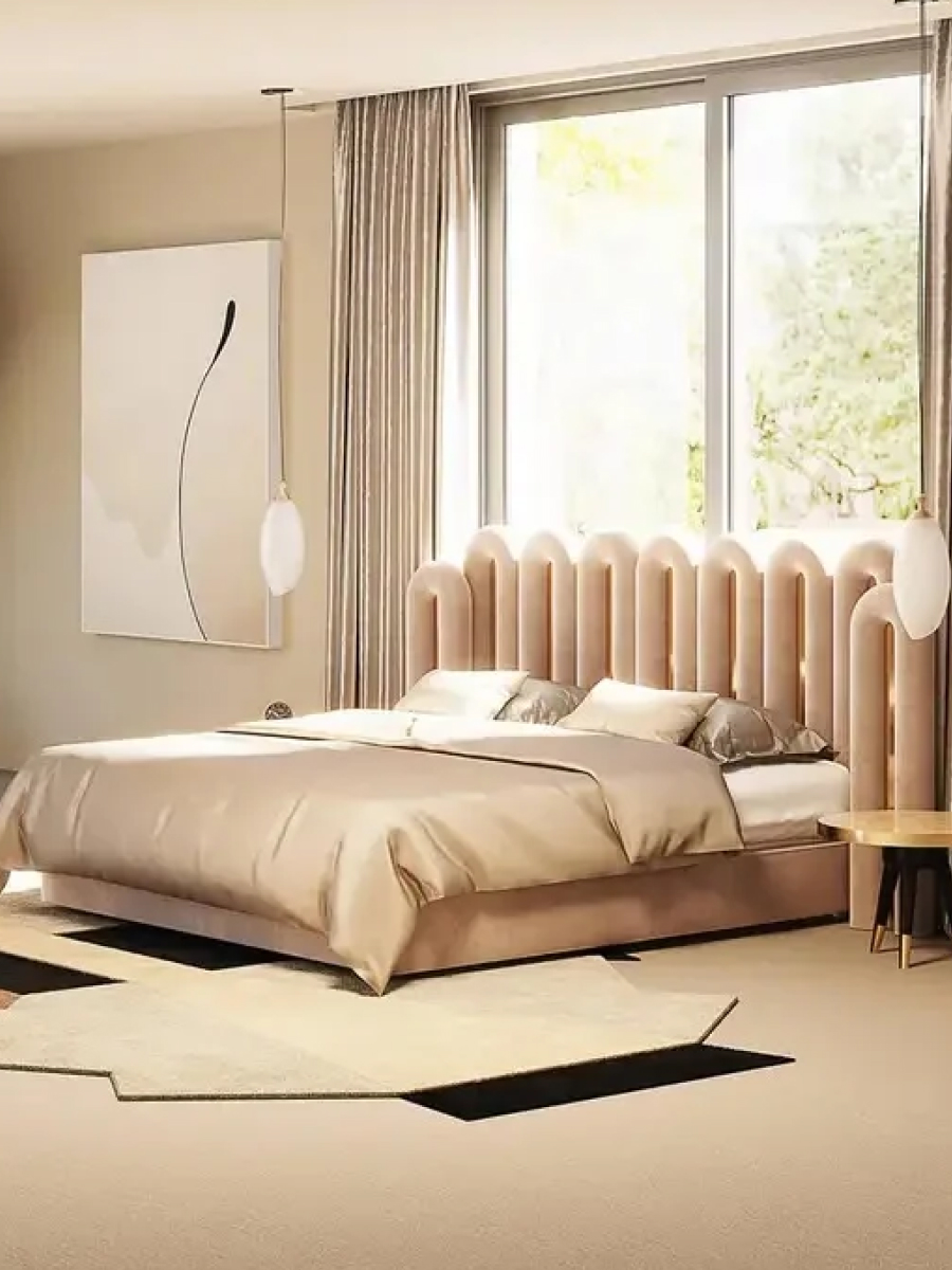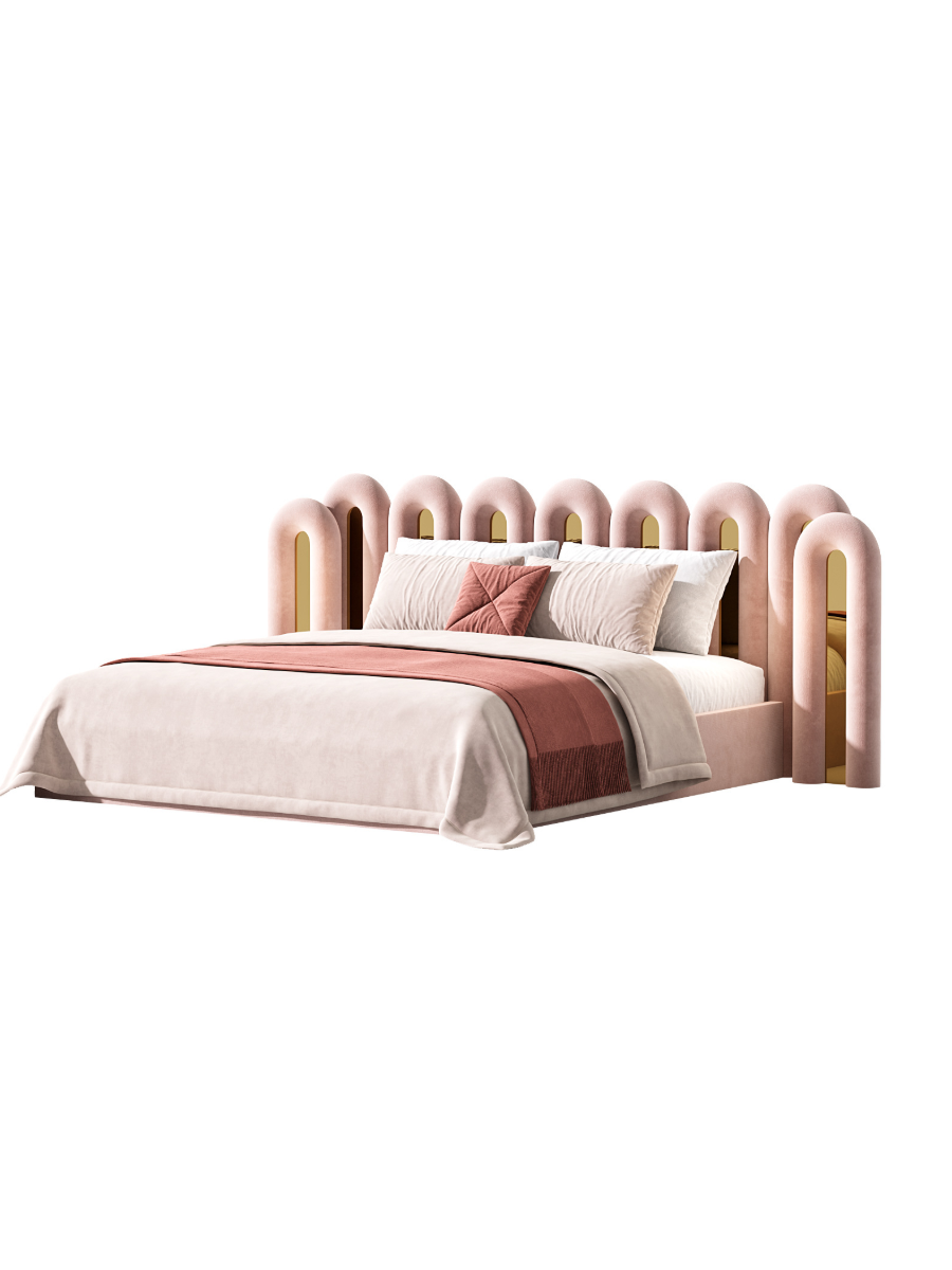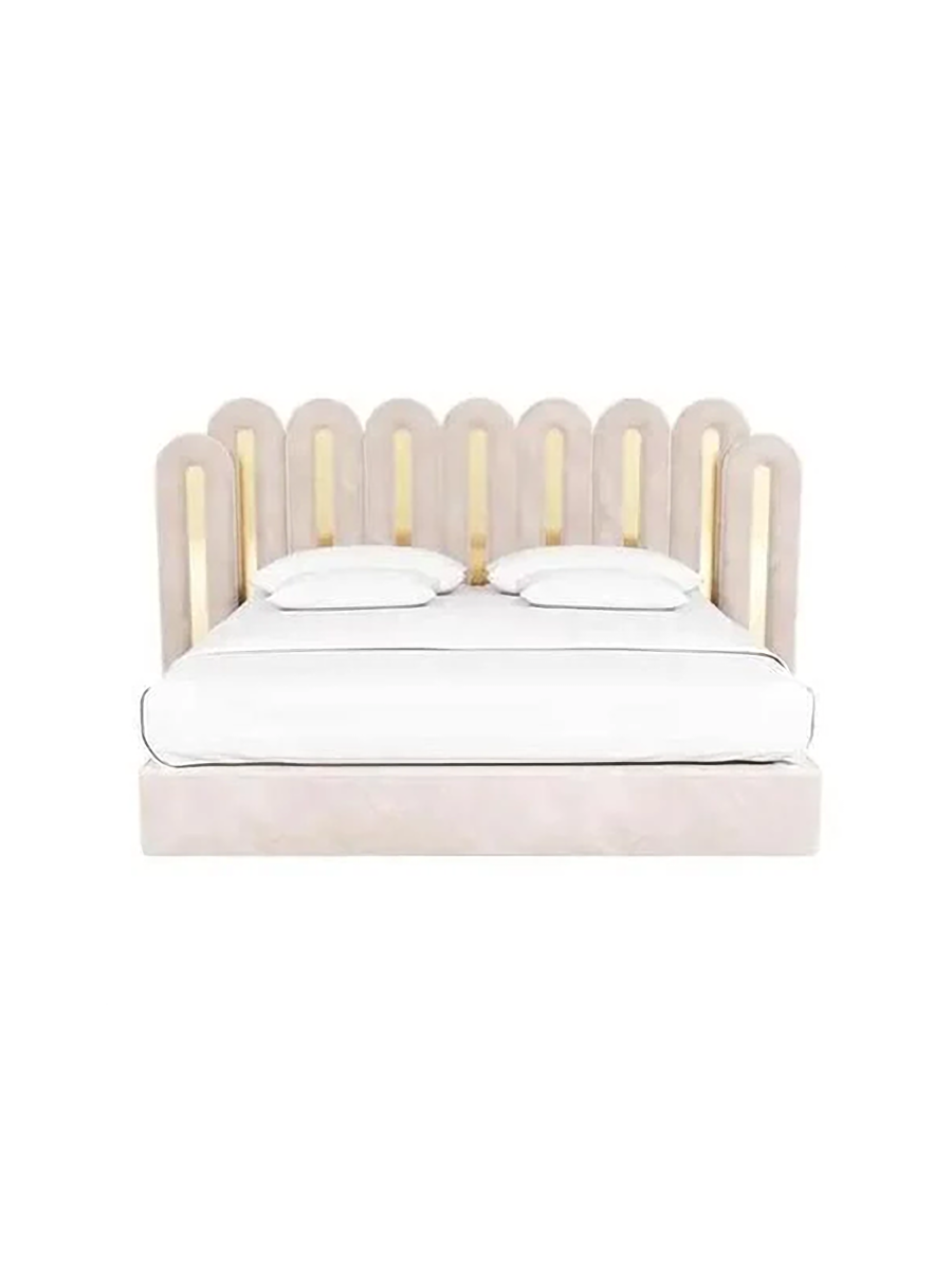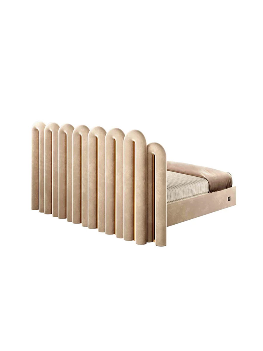 Le Verona incarne une élégance sculpturale. Sa tête de lit généreuse et ses lignes enveloppantes apportent une sensation de confort visuel et tactile. Le revêtement en velours crée une atmosphère feutrée, tandis que les détails en acier inoxydable poli à l’or soulignent un savoir-faire d’exception. Ce lit devient naturellement la pièce centrale de la chambre, idéal dans un intérieur moderne ou hôtelier.