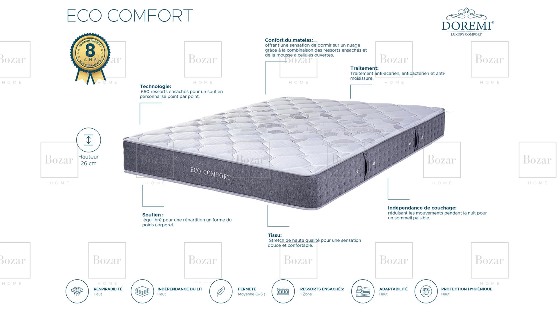 l’ECO CONFORT, conçu à partir de matériaux de qualité supérieure et fabriqué avec des détails raffinés. Ce matelas offre un soutien équilibré et un sommeil confortable grâce à sa composition unique. La structure cellulaire de la mousse permet une excellente aération pour maintenir une température optimale pendant la nuit. De plus, notre produit convient à la plupart des morphologies, mais est particulièrement recommandé pour les personnes de forte corpulence. Les ressorts ensachés inclus s’adaptent parfaitement à votre anatomie, offrant un excellent maintien de la colonne vertébrale. Si vous cherchez à découvrir la sensation de dormir sur un nuage, alors notre matelas ECO CONFORT est fait pour vous. Choisissez la qualité et le confort avec notre produit de qualité supérieure.