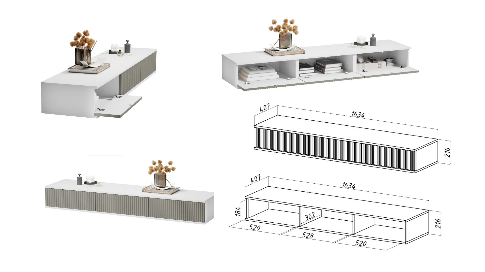 Le meuble TV mural Milos marie parfaitement fonctionnalité et esthétique contemporaine. Conçu pour les intérieurs modernes, il s’installe au mur pour libérer de l’espace au sol tout en apportant une solution élégante de rangement pour vos appareils multimédia. Sa finition mate au toucher doux s’accorde à merveille avec des décors épurés ou minimalistes.