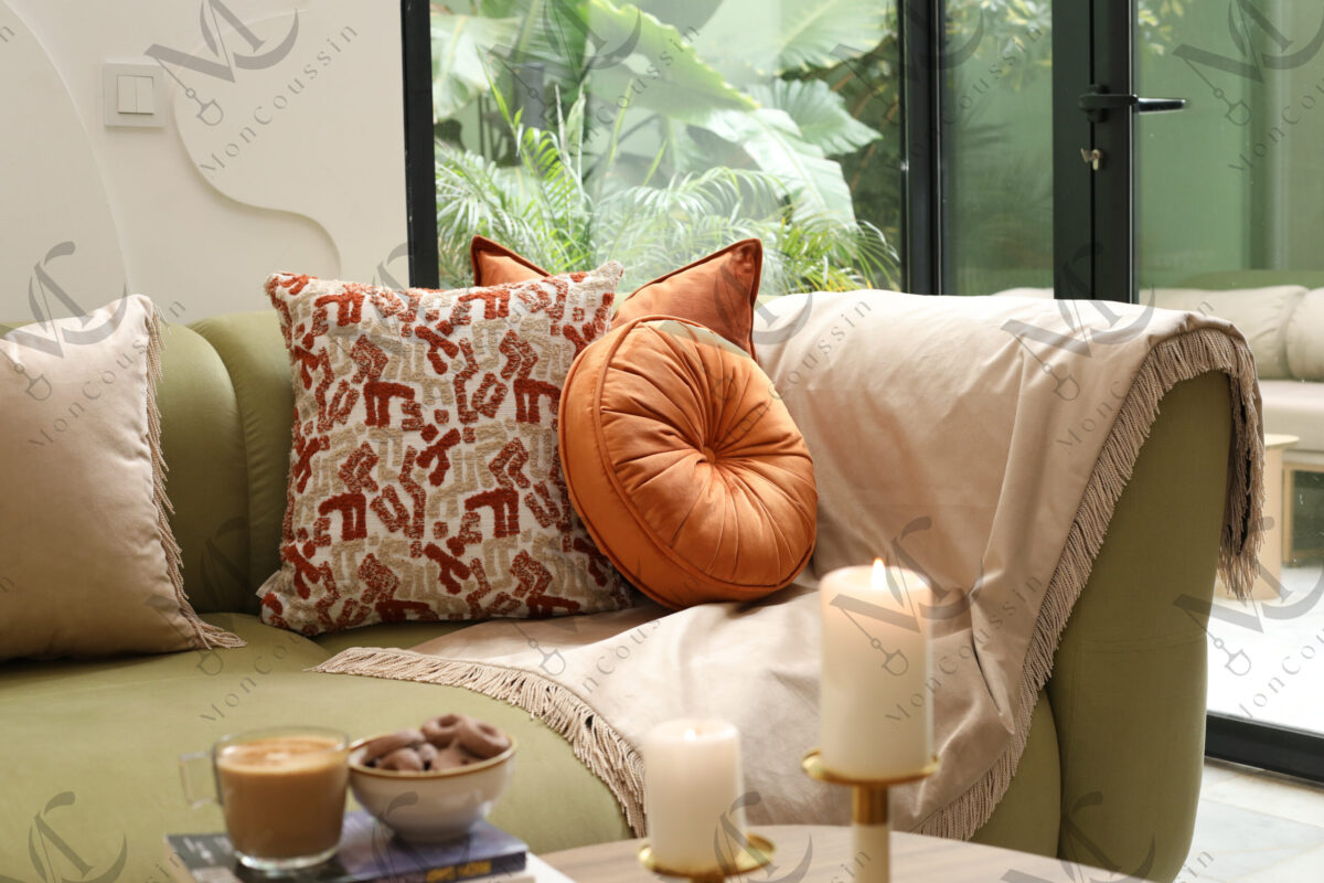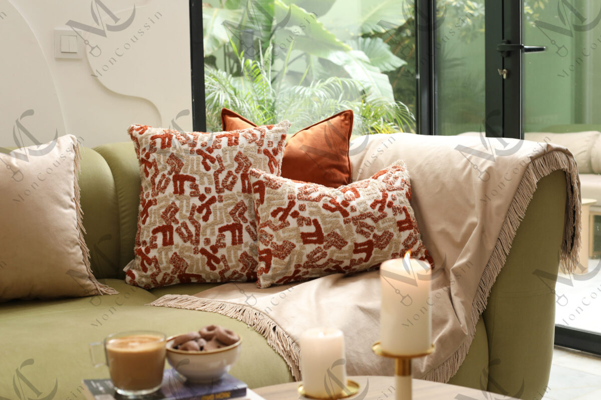 Coussin en bouclette 3D inspiré de la collection Queen Velvet. À associer avec les coussins en velours imprimé pour une composition harmonieuse.
