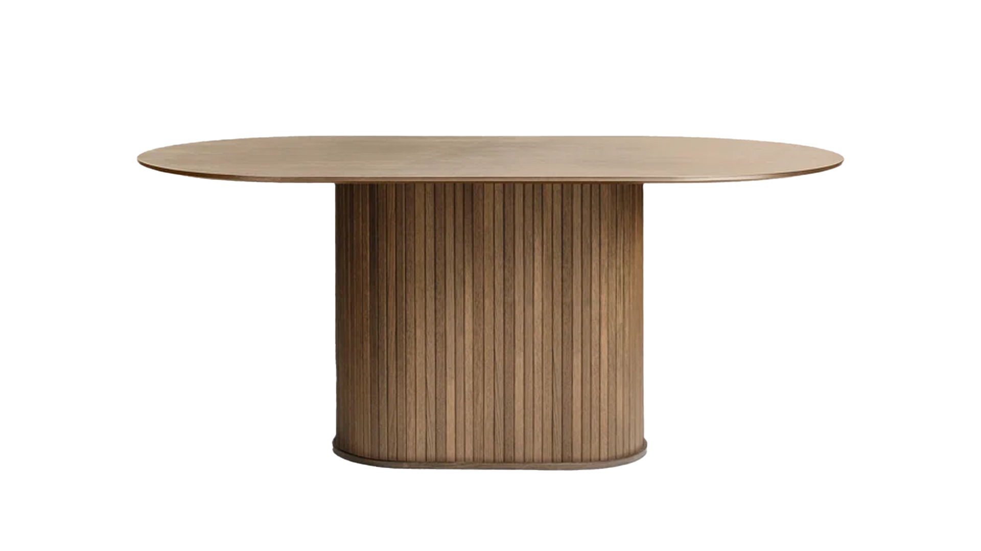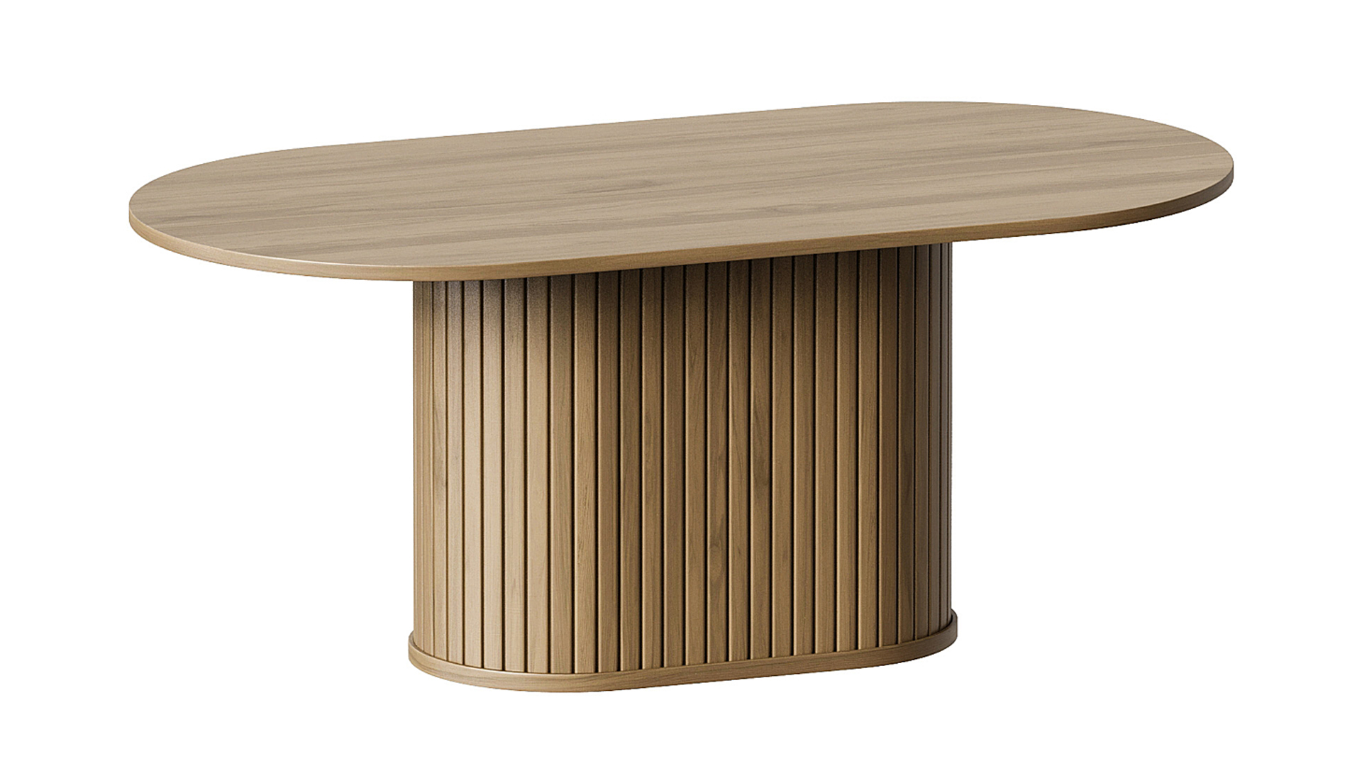 Apportez une touche d’élégance contemporaine à votre salle à manger avec la table Blume. Son plateau ovale en placage de chêne met en valeur les variations naturelles du bois, tandis que son piètement central à panneaux rainurés confère un caractère architectural distinctif. Inspirée du design scandinave et du style mid-century, cette table s’intègre harmonieusement dans divers intérieurs modernes.