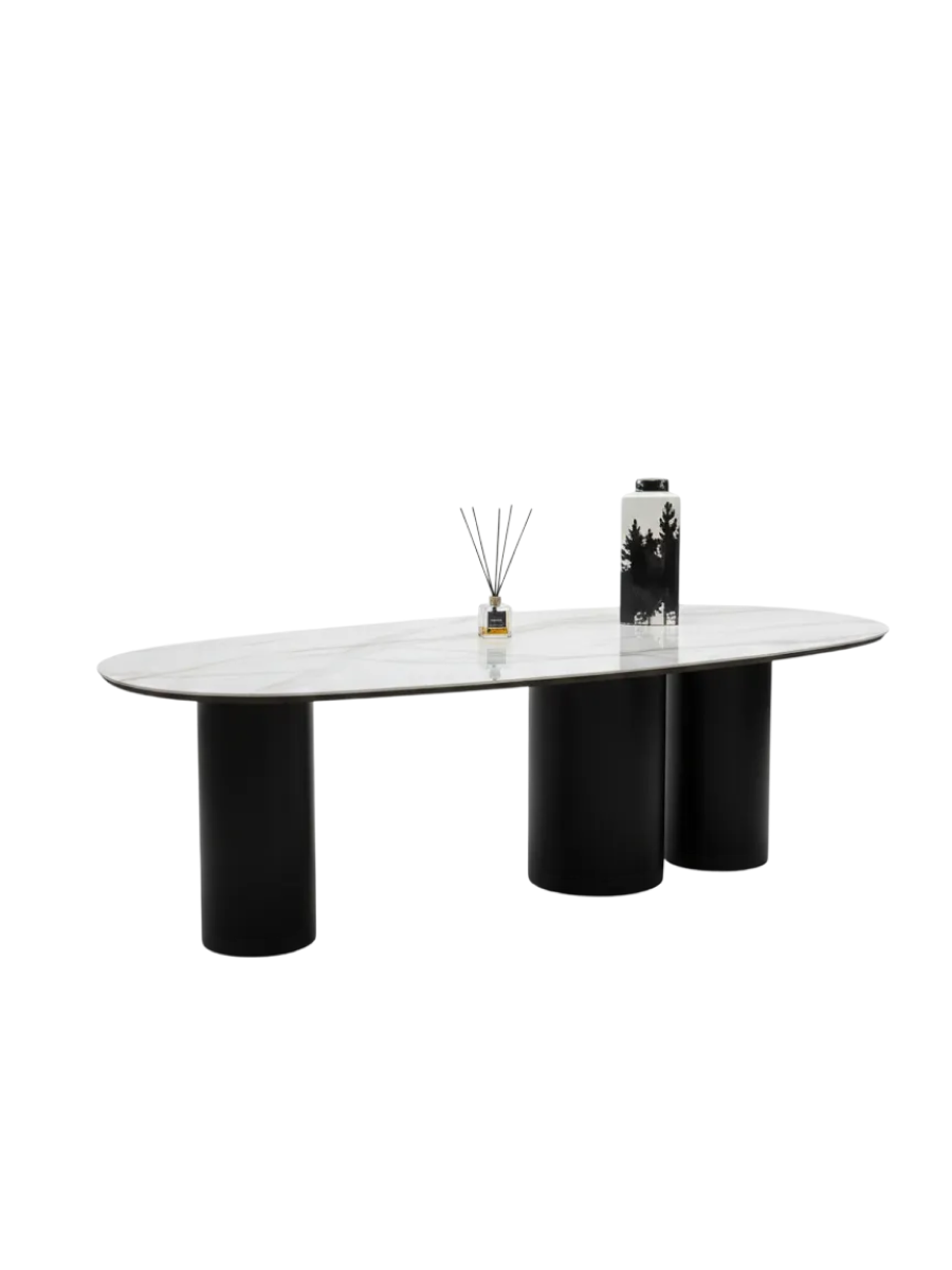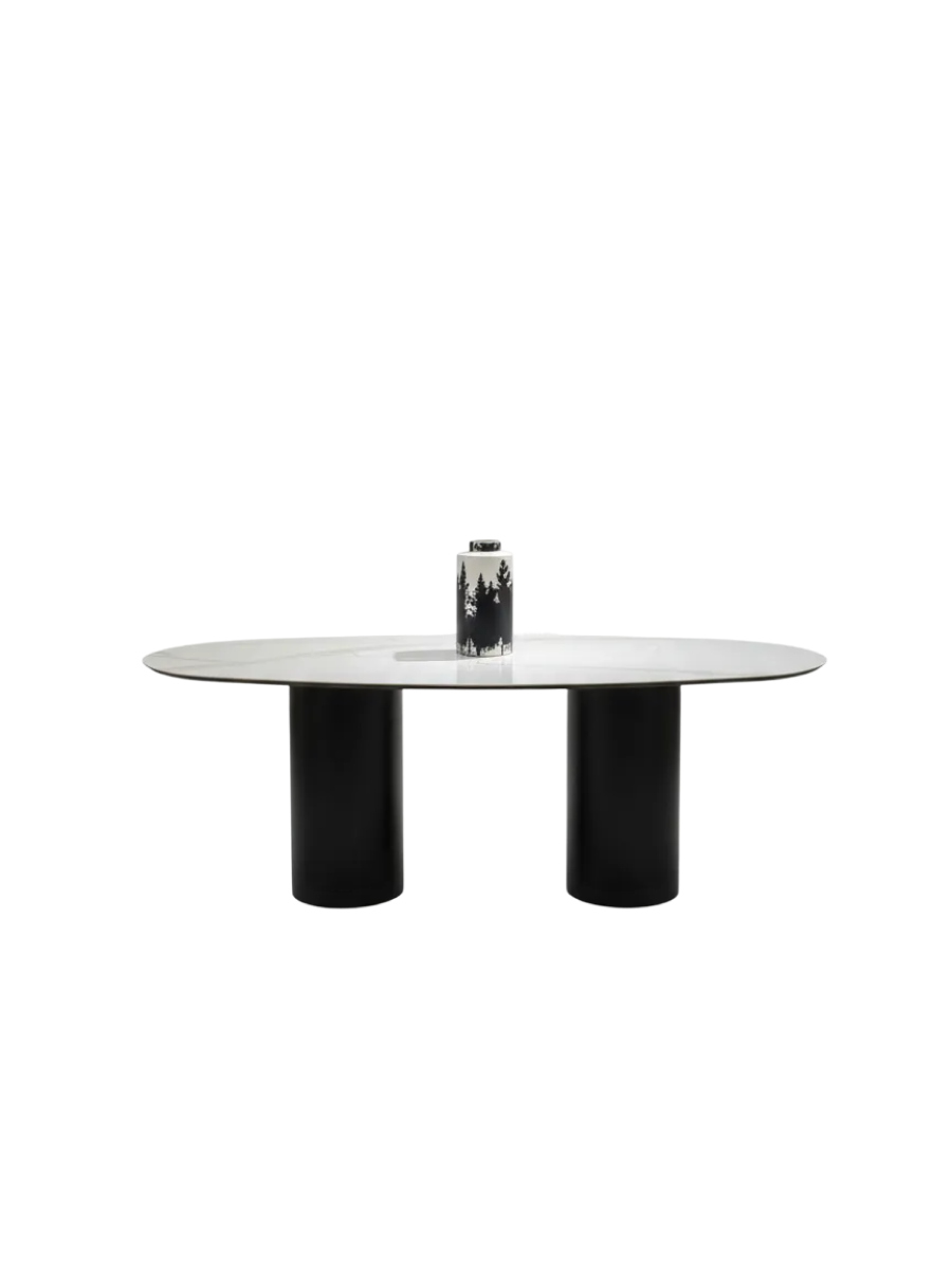 Table à manger Éclipse ovale au style contemporain. Plateau effet marbre (céramique/compact) avec finition élégante, piétement cylindrique noir mat. Disponible en plusieurs dimensions et finitions — contactez-nous pour une réalisation sur mesure.