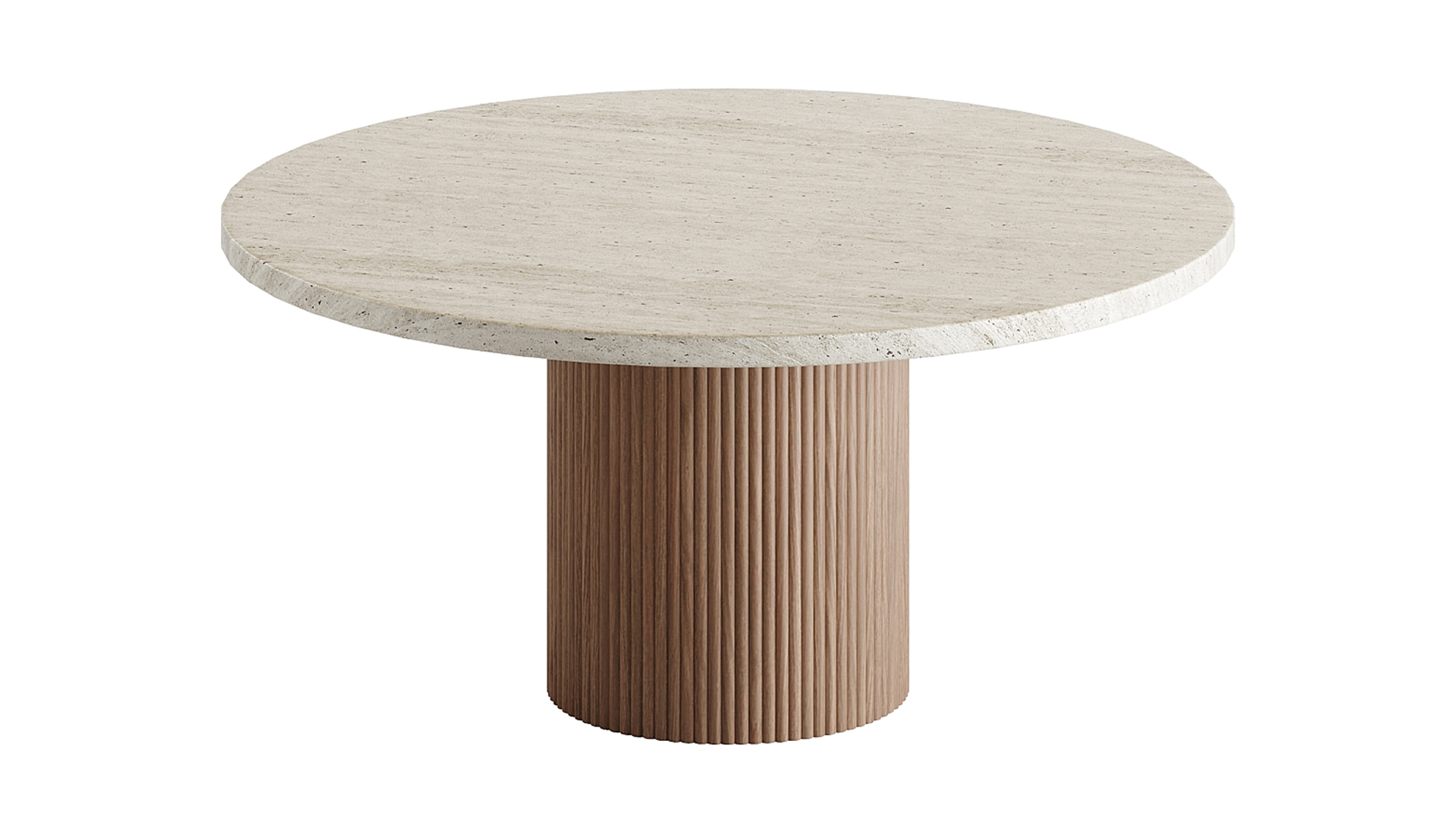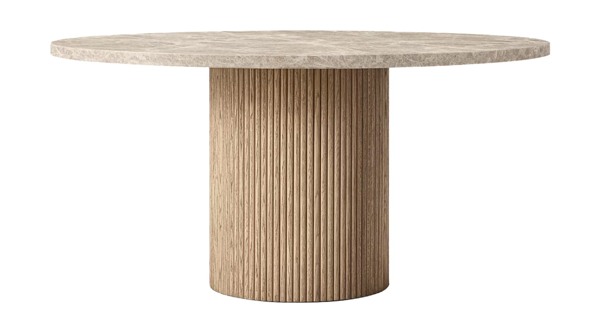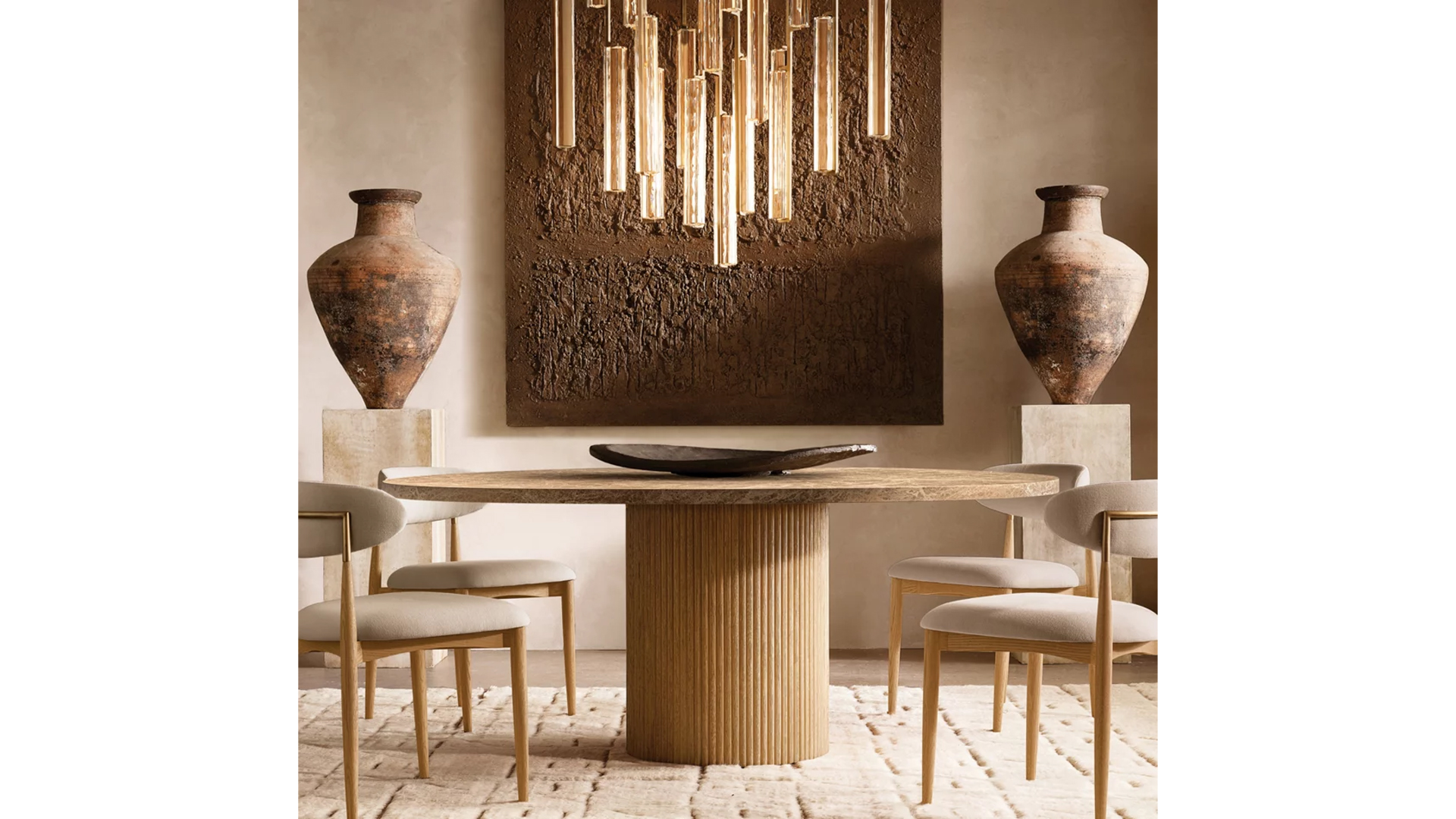 La table Pacini allie artisanat raffiné et esthétique moderne. Son plateau circulaire repose sur un piètement conique, formé de lattes de chêne massif brossé disposées verticalement, créant un jeu de textures et de profondeurs. Chaque latte est appliquée individuellement, témoignant d’un savoir-faire exceptionnel.